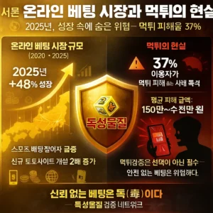 2025년 현재, 국내 온라인 베팅 시장은 급격한 성장세를 보이고 있습니다. 스포츠 베팅에 대한 관심이 높아지면서 수많은 토토사이트들이 등장했지만, 동시에 사용자들을 속이는 먹튀사이트도 함께 증가하고 있습니다.