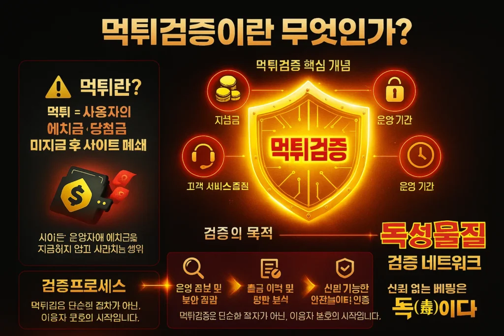 먹튀검증은 온라인 베팅 사이트가 신뢰할 수 있는지, 사용자의 자금을 안전하게 보호하는지를 확인하는 과정입니다. '먹튀'라는 용어는 사이트 운영자가 사용자의 예치금이나 당첨금을 지급하지 않고 사라지는 행위를 의미합니다.