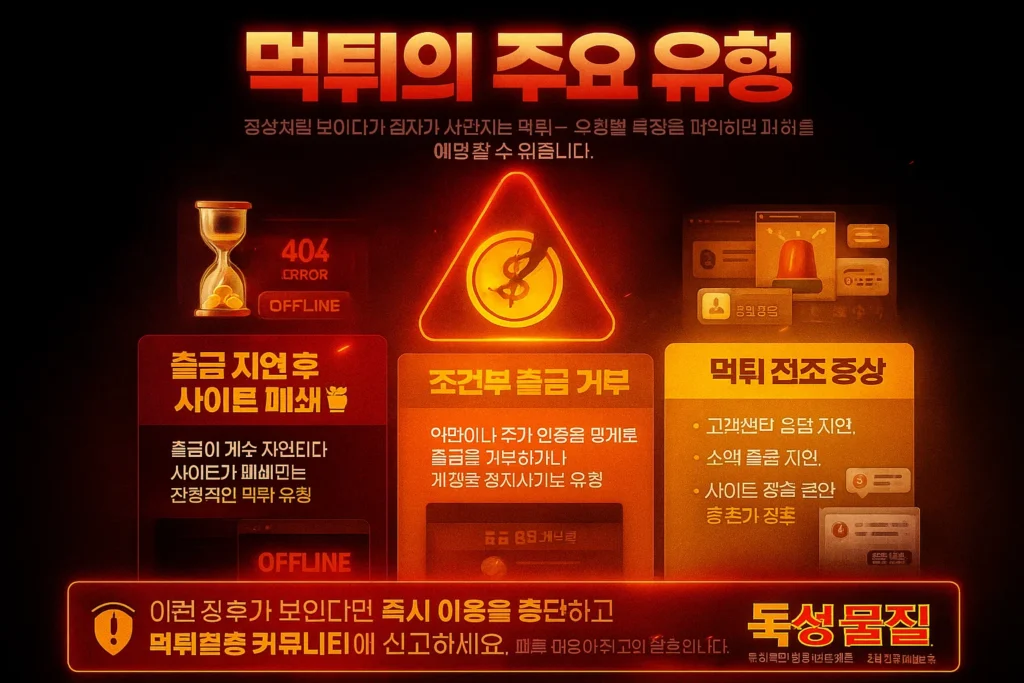 먹튀는 여러 형태로 나타납니다. 가장 흔한 유형은 출금 지연 후 사이트 폐쇄입니다. 운영자는 처음에는 정상적으로 서비스를 제공하다가 일정 금액이 모이면 갑자기 출금을 지연시키고 결국 사이트를 닫아버립니다.