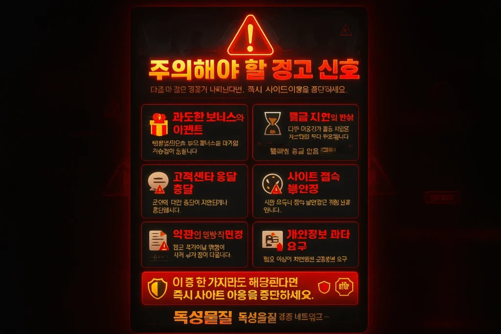세 번째는 먹튀 전조 증상을 보이는 경우입니다. 고객 센터 응답이 늦어지고, 소액 출금도 지연되기 시작하며, 사이트 접속이 불안정해지는 등의 신호가 나타납니다.